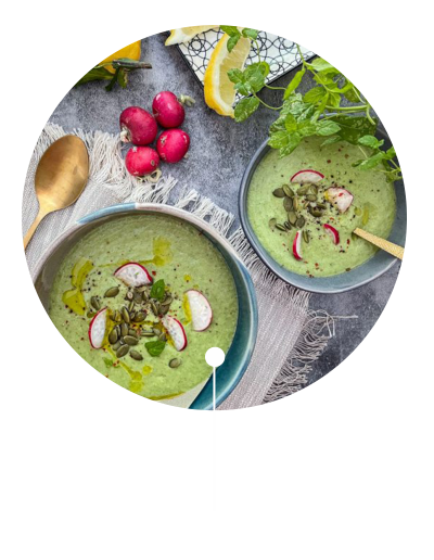 And voilà, just before bringing your Green Gazpacho to the table, all you have to do is portion the cold soup into small bowls or a deep plate and garnish with toasted pumpkin seeds, fresh mint leaves, a pinch of pink pepper and a drizzle of extra virgin olive oil.